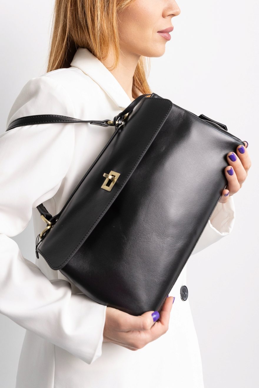 Элегантная сумка-портфель трапециевидной формы из натуральной кожи. Модель комплектуется двумя ремнями: короткой ручкой для ношения в руке или на сгибе локтя (длина 70 см) и длинным регулируемым ремнём для ношения через плечо. · Материал: натуральная кожа. · Цвет: черный. · Застежка : клапан с портфельным замком. · Производство: Турция · Размеры: 28,5 см (ширина) х 24 см (высота) х 9 см (глубина) · Длина короткой ручки: 70 см . Длинный и короткий регулируемый плечевой ремень в комплекте.