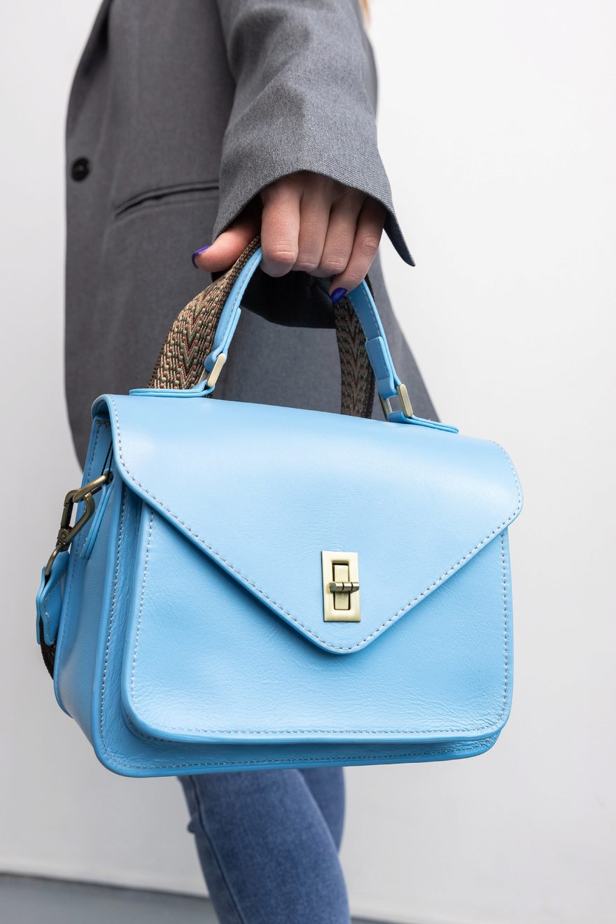 Яркая сумка-почтальонка небесно-голубого оттенка из натуральной итальянской кожи. Комплектуется двумя сменными ремнями — удобным широким текстильным и элегантным узким кожаным, что позволяет легко менять образ. Фурнитура под старину и короткая ручка для ношения в руку завершают ее универсальный дизайн. · Материал: Натуральная итальянская кожа · Цвет: Небесно-голубой · Фурнитура: Антик · Размер: 23 × 19 × 8 см · Комплектация: 2 регулируемых ремня (кожаный + текстильный), короткая ручка 24 см