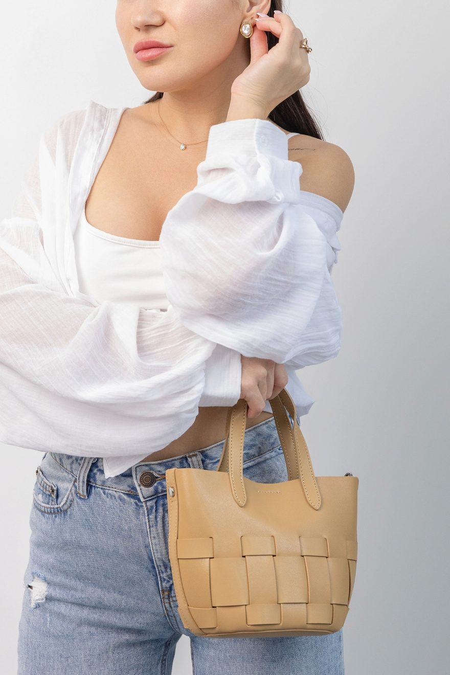 Элегантность, которая всегда под рукой. Эта бежевая мини-сумка из плетеной итальянской кожи — идеальный аксессуар на все случаи жизни. · Материал: Натуральная кожа · Цвет: Бежевый. · Размер: (19,5х12 см) идеально подходит для повседневного использования. ·Одно отделение. Вместит все самое необходимое: телефон, ключи, карточки и помаду.