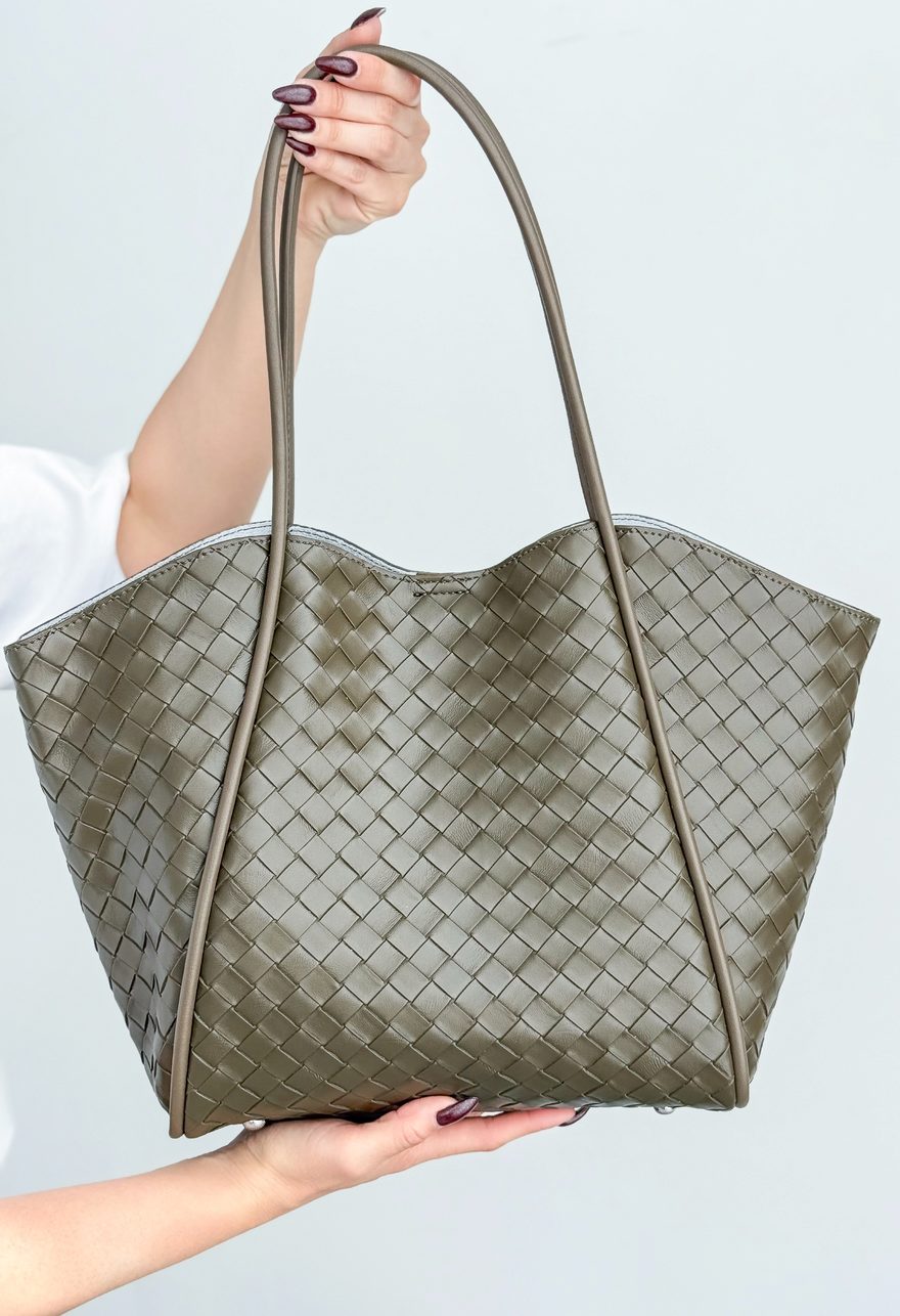 Ощутите дыхание Италии с этой невероятно эффектной сумкой-шопером. Ее главная особенность — аутентичное плетение из натуральной кожи насыщенного оливкового оттенка, напоминающего о солнечных оливковых рощах. Элегантная трапеция формы, строгая, но не скучная, подчеркнет вашу индивидуальность. Она не просто вещь, она — акцент. Благодаря двум ручкам, вы сможете легко комбинировать ее с разными образами: от повседневного джинсового ансамбля до элегантного пальто. Магнитная кнопка — это продуманная деталь для современной женщины, которая ценит не только стиль, но и функциональность. А внутри — сюрприз в виде защищенного молнией кармана для тех самых важных мелочей.